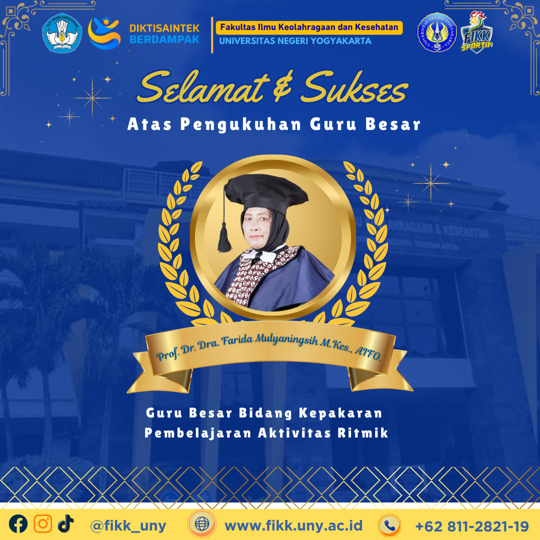 Fakultas Ilmu Keolahragaan dan Kesehatan (FIKK) Universitas Negeri Yogyakarta (UNY) menyampaikan ucapan selamat dan apresiasi atas pengukuhan Prof. Dr. Dra. Farida Mulyaningish, M.Kes., AIFO sebagai Guru Besar Bidang Kepakaran Pembelajaran Aktivitas Ritmik.