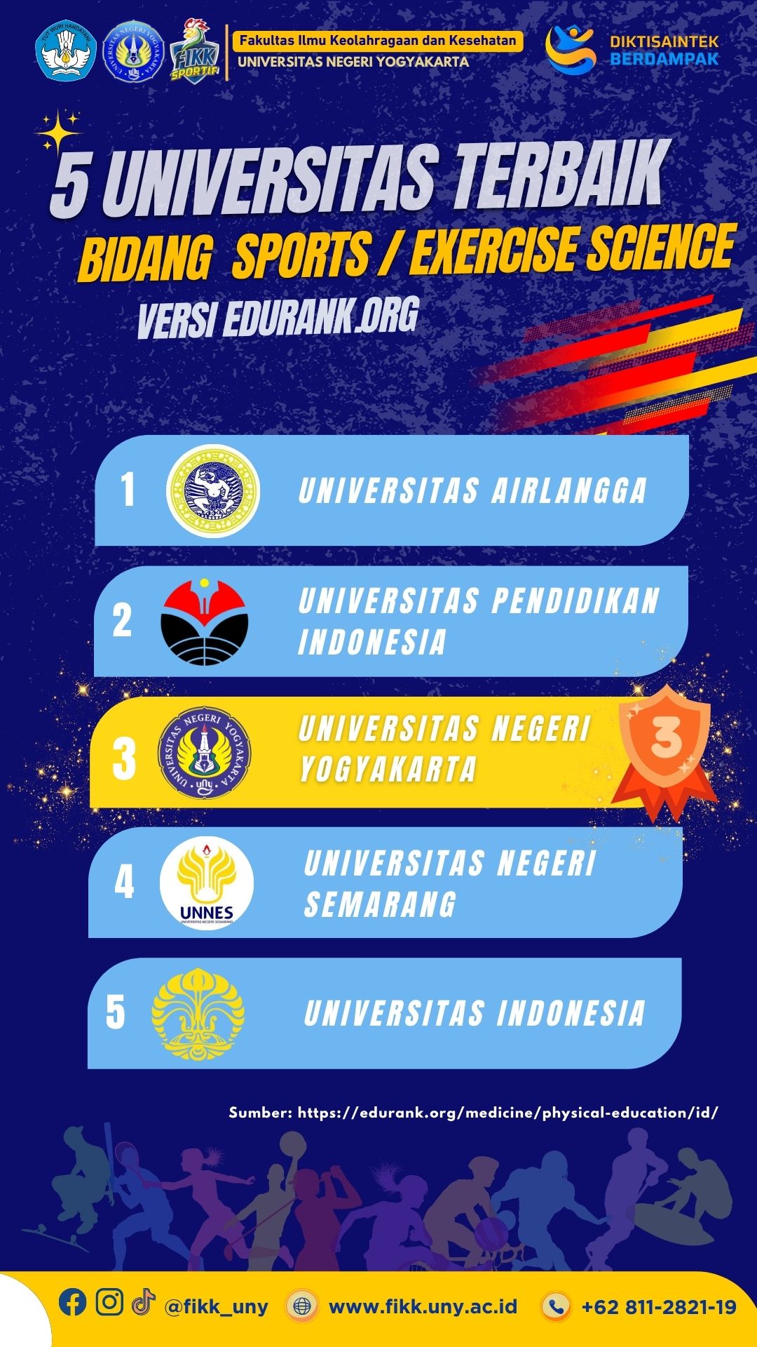 Universitas Negeri Yogyakarta (UNY) kembali mencatatkan prestasi akademik yang membanggakan: pada pemeringkatan topik Sports / Exercise Science versi EduRank.org, UNY menempati posisi ketiga terbaik di Indonesia. Pencapaian ini menegaskan komitmen UNY, khususnya Fakultas Ilmu Keolahragaan dan Kesehatan (FIKK UNY), dalam pengembangan ilmu keolahragaan melalui riset, publikasi ilmiah, dan penguatan kapasitas akademik yang berdampak langsung pada masyarakat dan praktik keolahragaan. Data pemeringkatan EduRank yang dirilis menunjukkan indeks riset dan keluaran publikasi sebagai salah satu indikator penilaian yang digunakan.