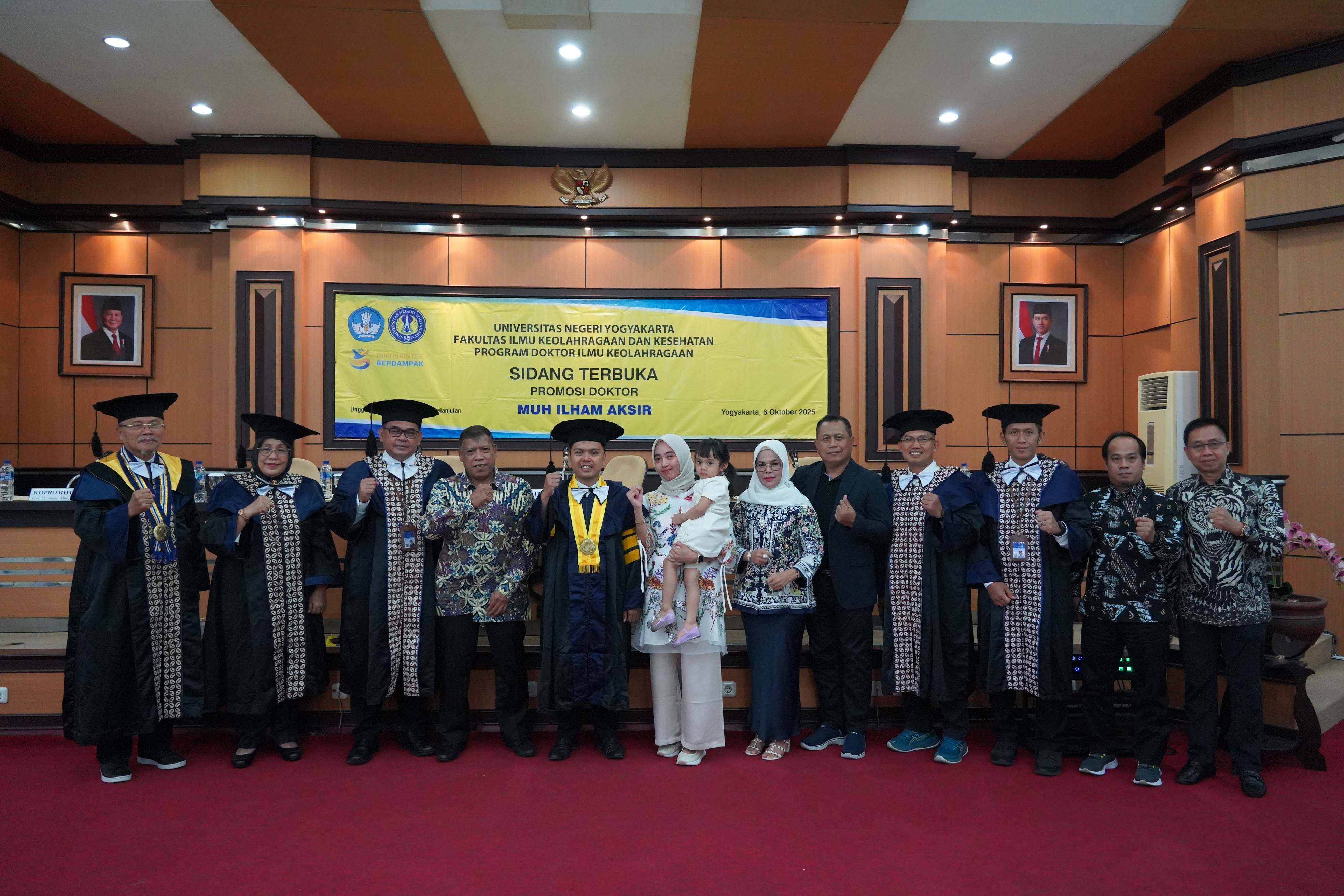 Fakultas Ilmu Keolahragaan dan Kesehatan (FIKK) Universitas Negeri Yogyakarta kembali melahirkan doktor baru melalui Sidang Terbuka Promosi Doktor Program Studi S3 Ilmu Keolahragaan. Dalam sidang yang diselenggarakan pada Senin, 6 Oktober 2025, Muh Ilham Aksir, dosen Universitas Negeri Makassar, resmi meraih gelar Doktor Ilmu Keolahragaan dengan disertasi berjudul “Pengembangan Media Pembelajaran Trainer Ilham Aksir (TIA) Berbasis Aplikasi Android untuk Meningkatkan Keterampilan Groundstroke Petenis Pemula.”