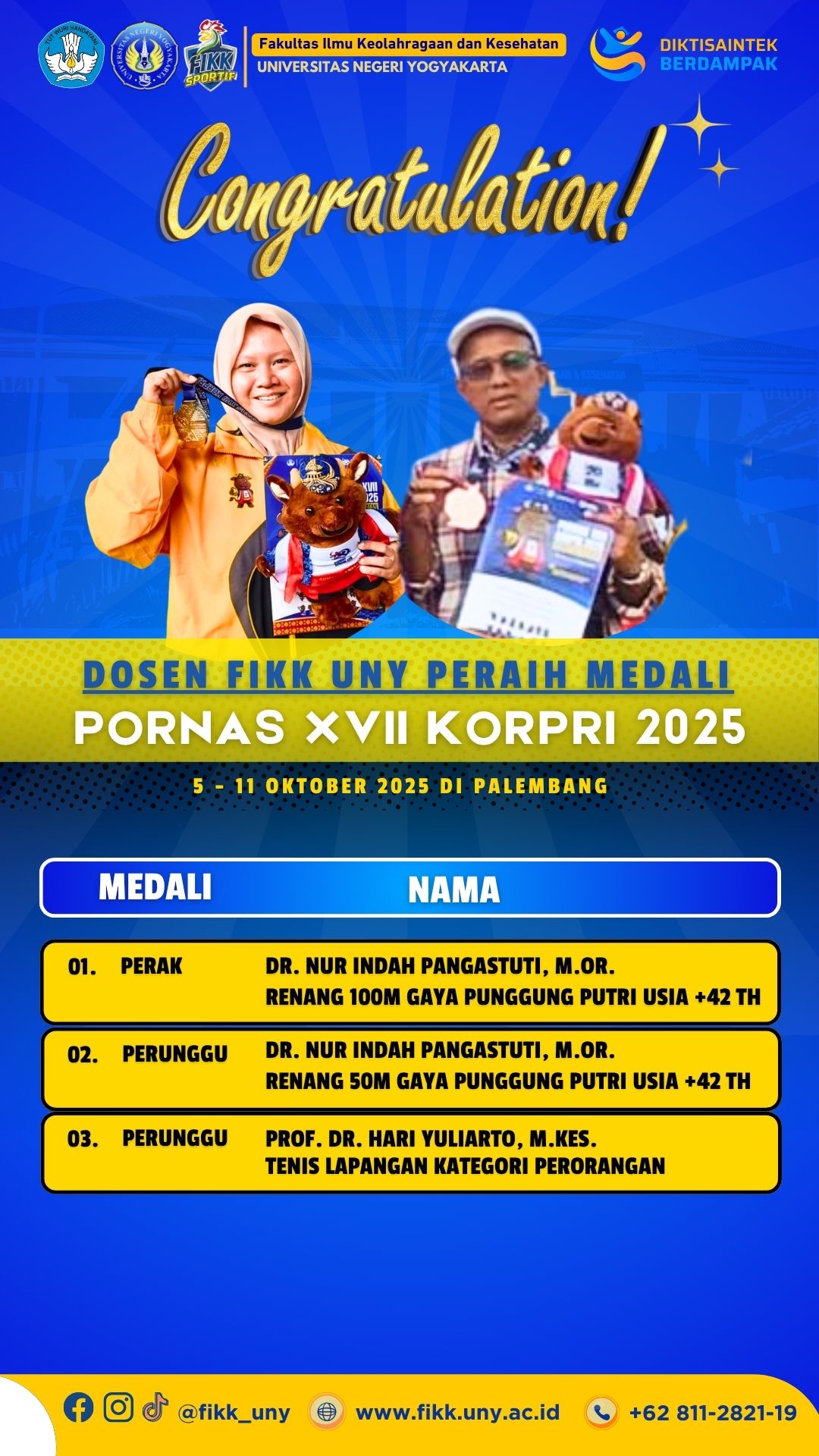 Dosen FIKK UNY Raih 3 Medali di Ajang PORNAS XVII KORPRI 2025 di Palembang