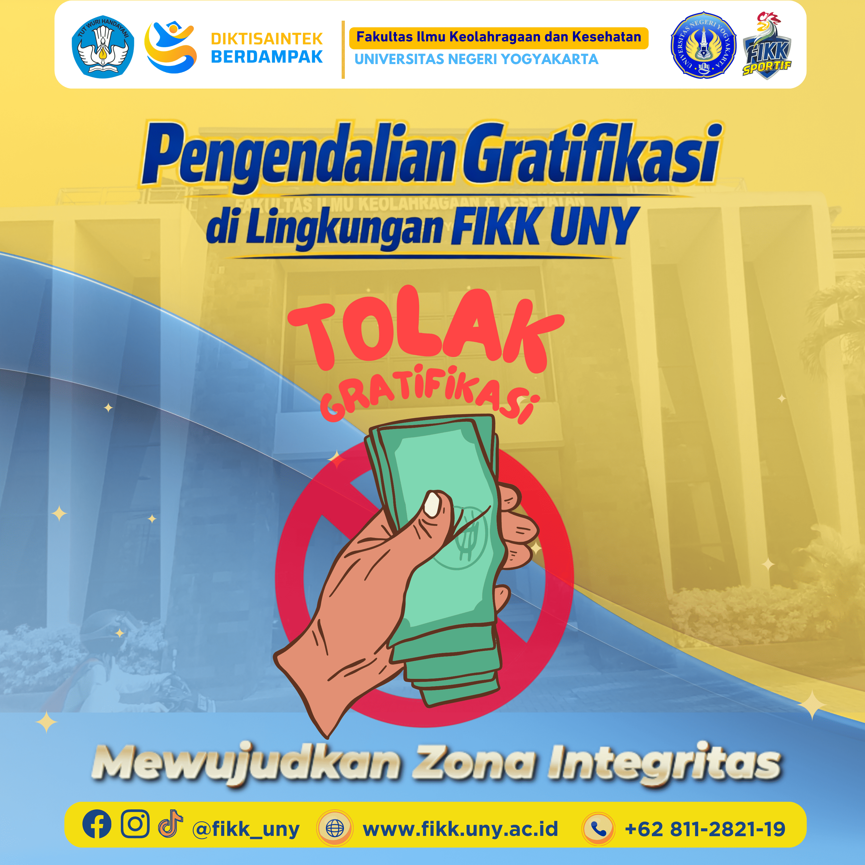 Upaya memperkuat budaya integritas dan tata kelola yang bersih, Fakultas Ilmu Keolahragaan dan Kesehatan Universitas Negeri Yogyakarta (FIKK UNY) kembali menegaskan komitmennya untuk menolak segala bentuk gratifikasi. Komitmen ini menjadi bagian penting dalam mewujudkan Zona Integritas menuju institusi yang transparan, akuntabel, dan berintegritas. Melalui kampanye bertajuk “Tolak Gratifikasi”, sivitas akademika FIKK UNY diajak untuk bersama-sama menumbuhkan kesadaran bahwa gratifikasi, dalam bentuk apa pun, dapat berpotensi menimbulkan konflik kepentingan serta merusak nilai-nilai profesionalisme dalam penyelenggaraan layanan publik dan kegiatan akademik.
